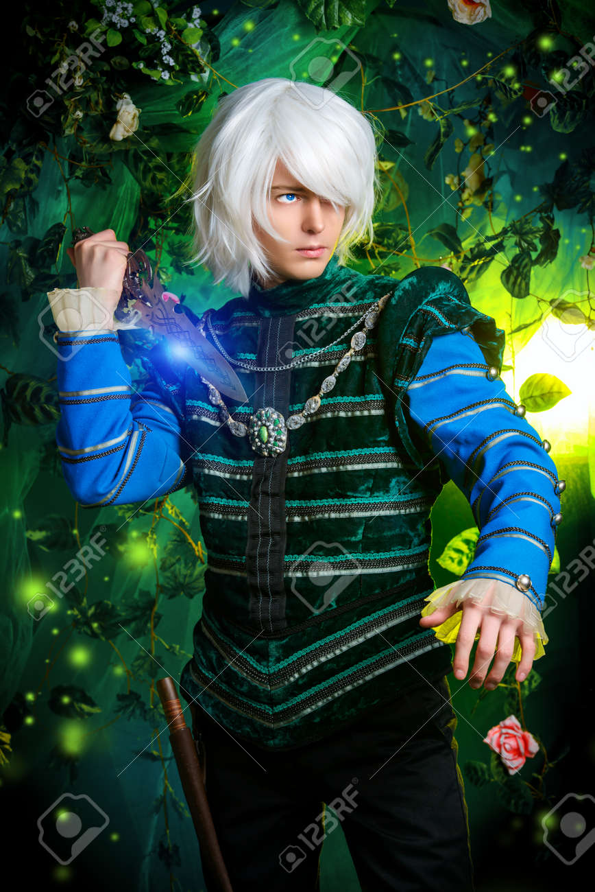 魔法の森で手に短剣で美しい金髪のエルフ ファンタジー アニメ スタイル