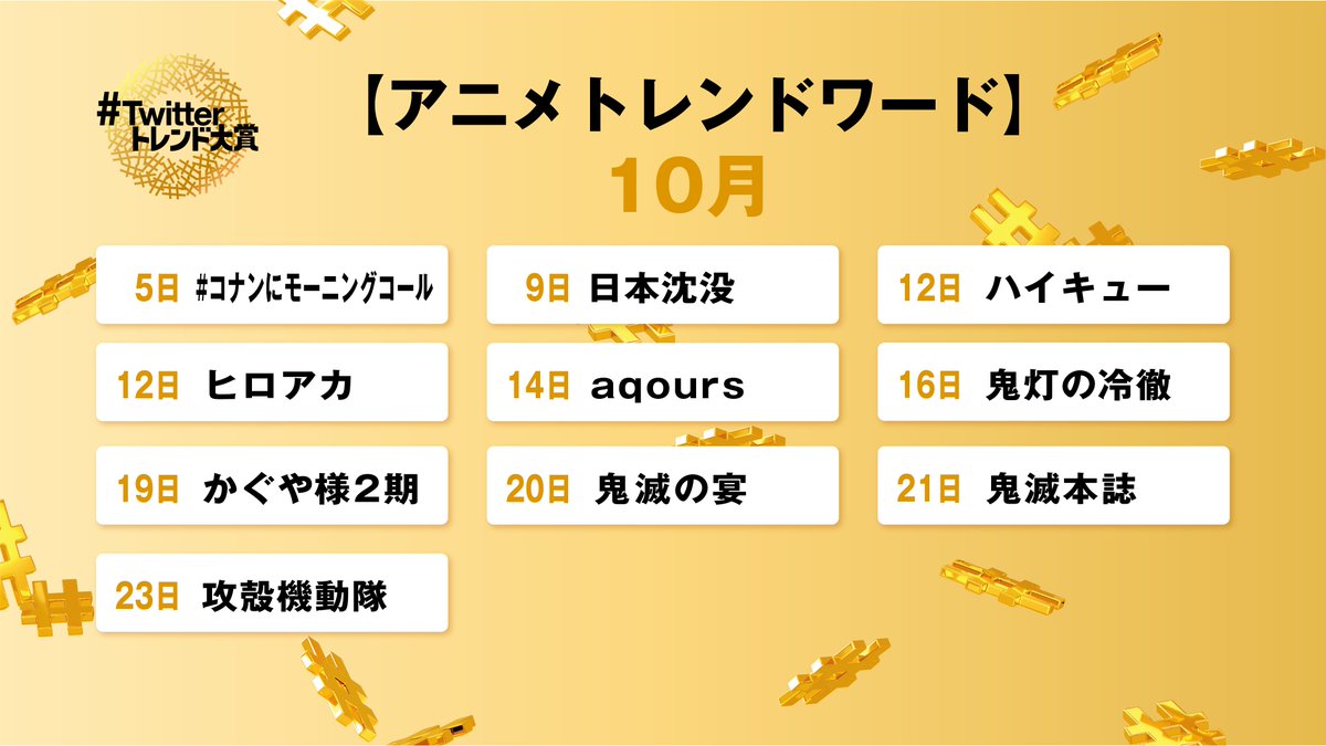 ツイッタートレンド大賞 on twitter アニメトレンドワード10月発表 鬼滅の宴 や コナンにモーニングコール など気になるワードがいっぱいです twitterトレンド大賞 アニメトレンド2019 田村淳 オーイシマサヨシ 小西克幸 小宮有紗 三田麻央