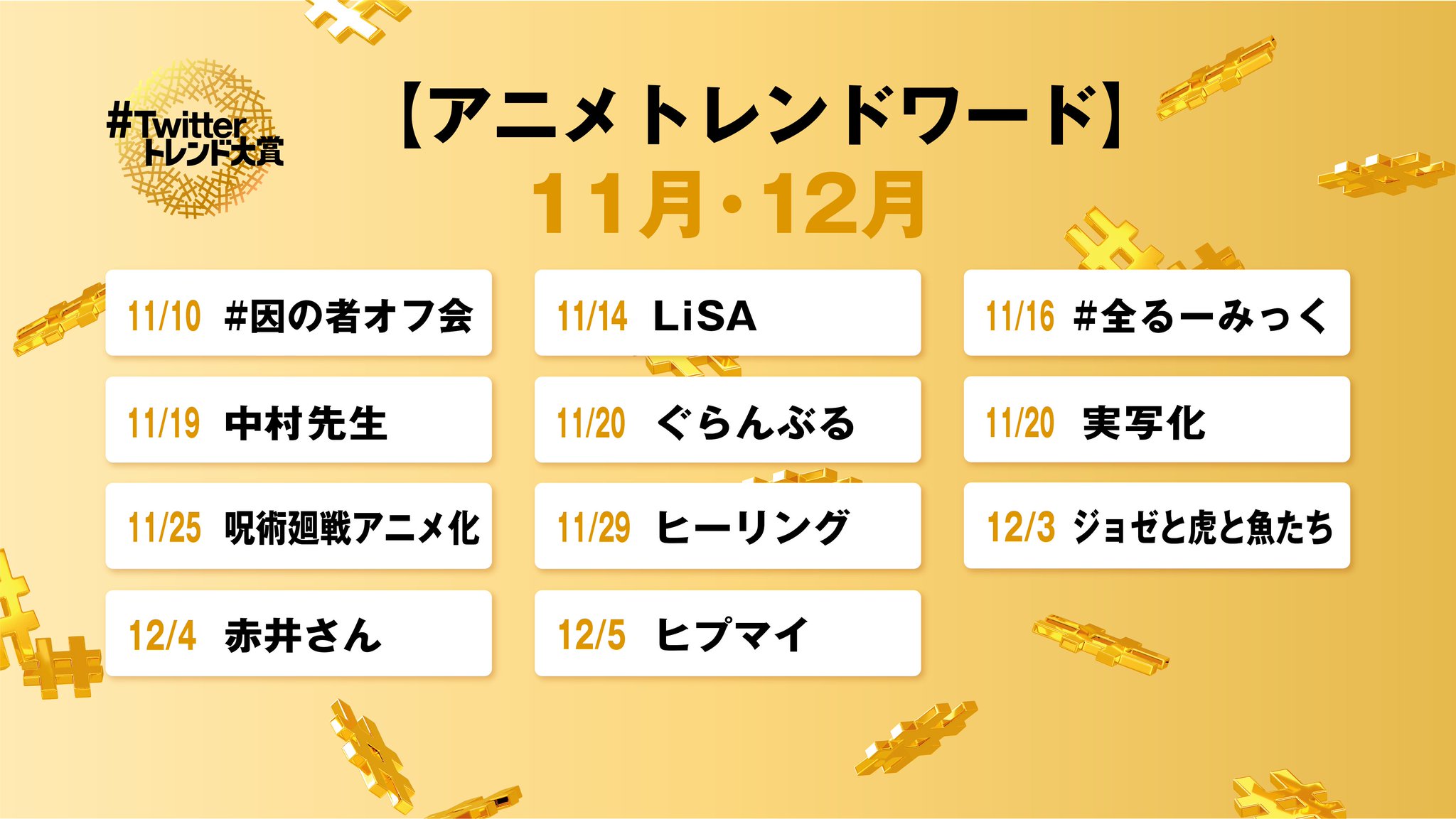 ツイッタートレンド大賞 on twitter 2020年アニメトレンド 10月 11月 今年を代表するアニメのトレンドが並んでいます twitterトレンド大賞 アニメトレンド2020