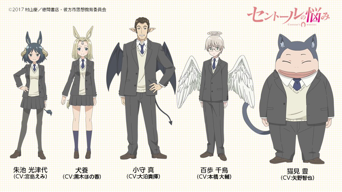 アニメ セントールの悩み 公式 على تويتر サブキャラクター解禁 朱池美津代 犬養 小守真 百歩千鳥 猫見豊のキャラクター設定を公開しました https t co pgdtkfwqgp セントール centaur