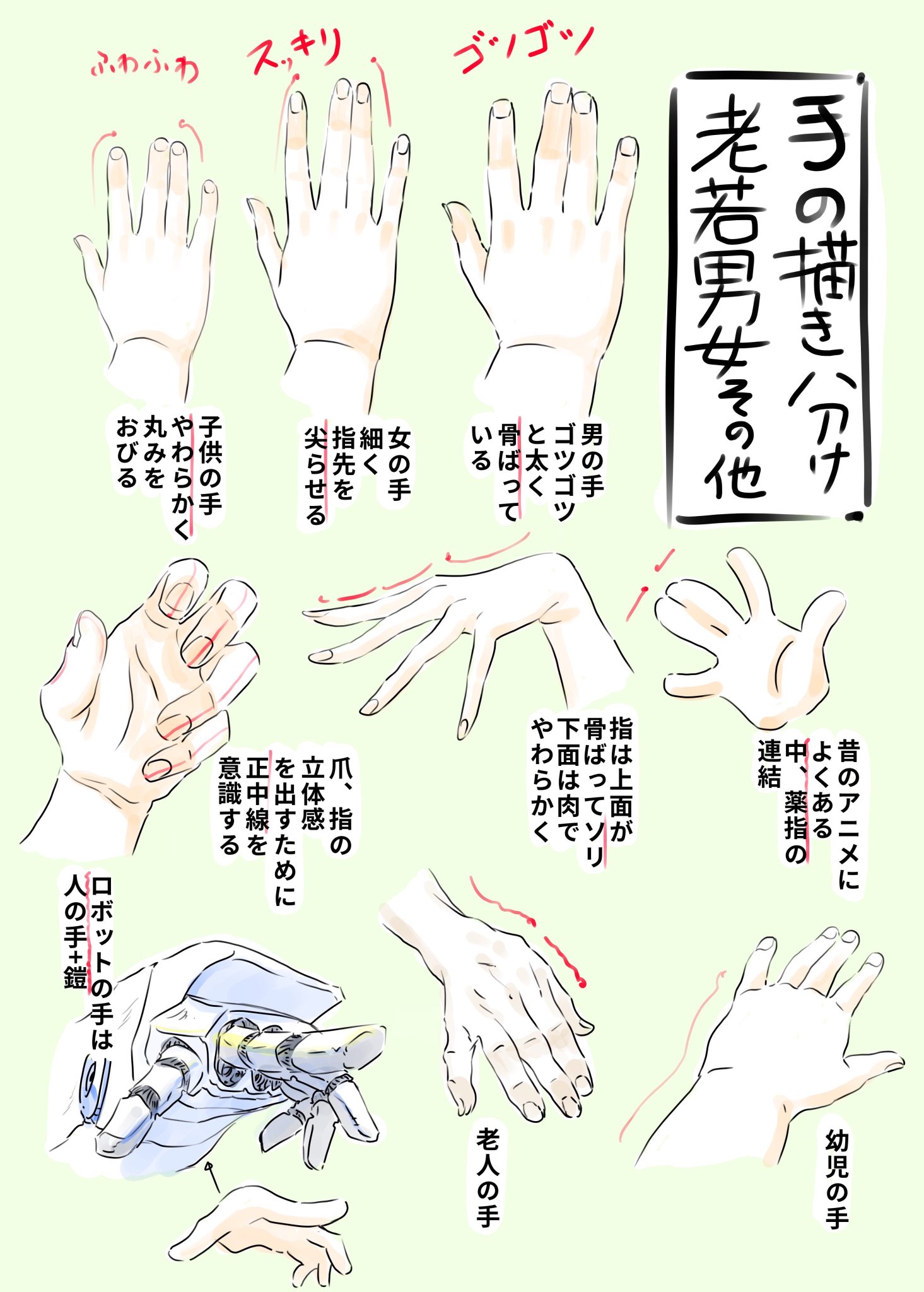 アニメ私塾 on twitter 手の描き方 基本 子供手袋で大まかに捉える 手の甲と指は1 1 手首の軸ズレ 指も軸ズレ 可動ポイントは甲の骨 応用 男 ゴツゴツ 女 先細く 子供 柔らかく 爪は指の正中線意識 昔のアニメの中薬指合体