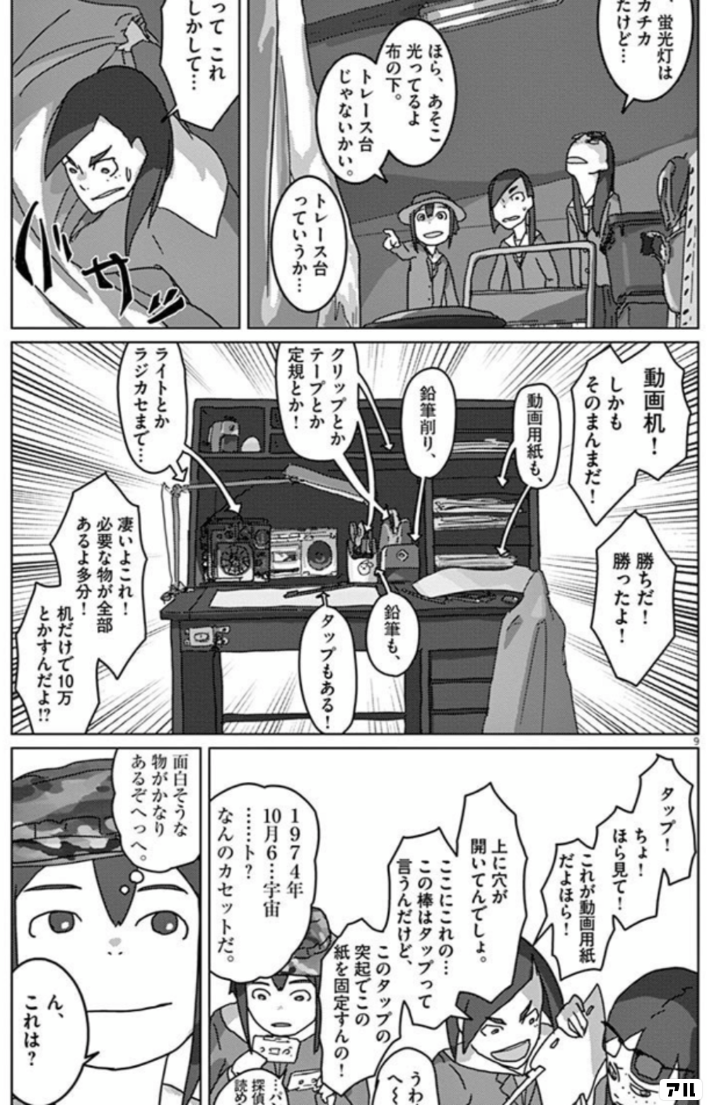 ほら あそこ 光ってるよ 布の下 トレース台 じゃないかい トレース台 っていうか 動画机 しかもそのまんまだ 勝ちだ 勝ったよ 動画用紙も 鉛筆削り クリップとかテープとか定規とか 鉛筆もタップもある ライトとかラジカセまで 凄いよこれ 必要な物