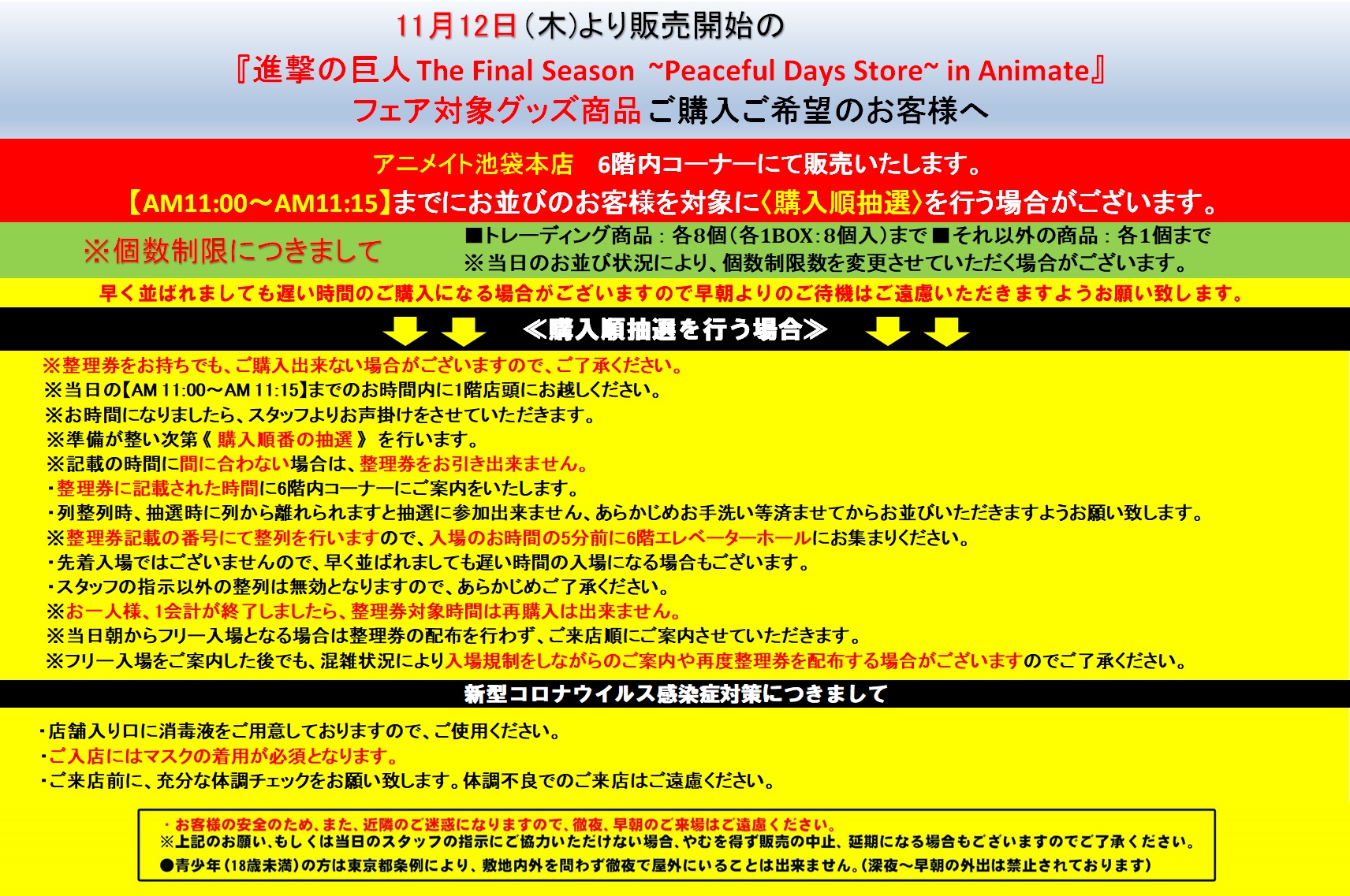 アニメイト池袋本店 on twitter 6fフェア情報 11 12 木 より当店6fにて開催の 進撃の巨人 the final season peaceful days store in animate におきまして 入場抽選を行います また 入場についての注意事項がございます 添付画像をよくご確認の上 ご