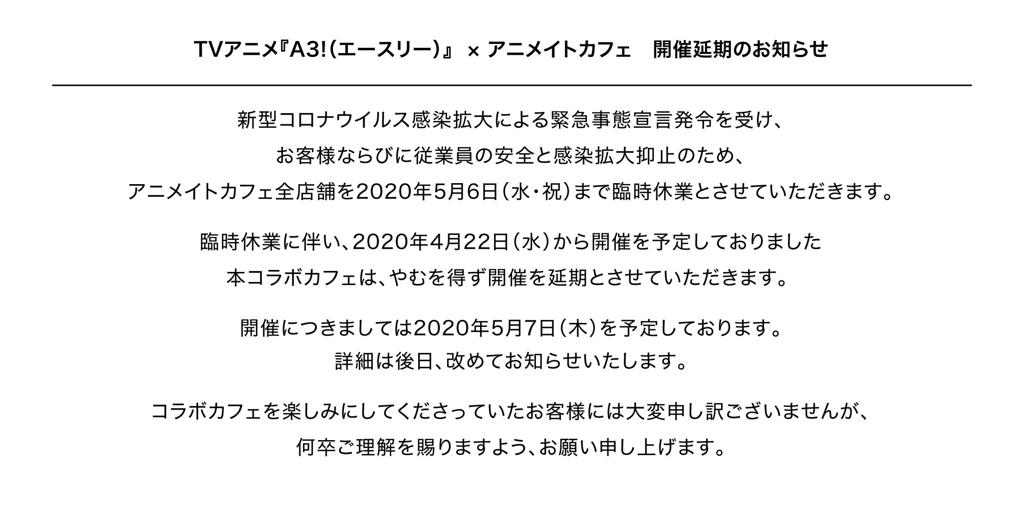 a3 アニメイトカフェ 池袋3号店 名古屋2号店コラボ 2020 5 7 2020 5 25 延期 コラボカフェまとめ