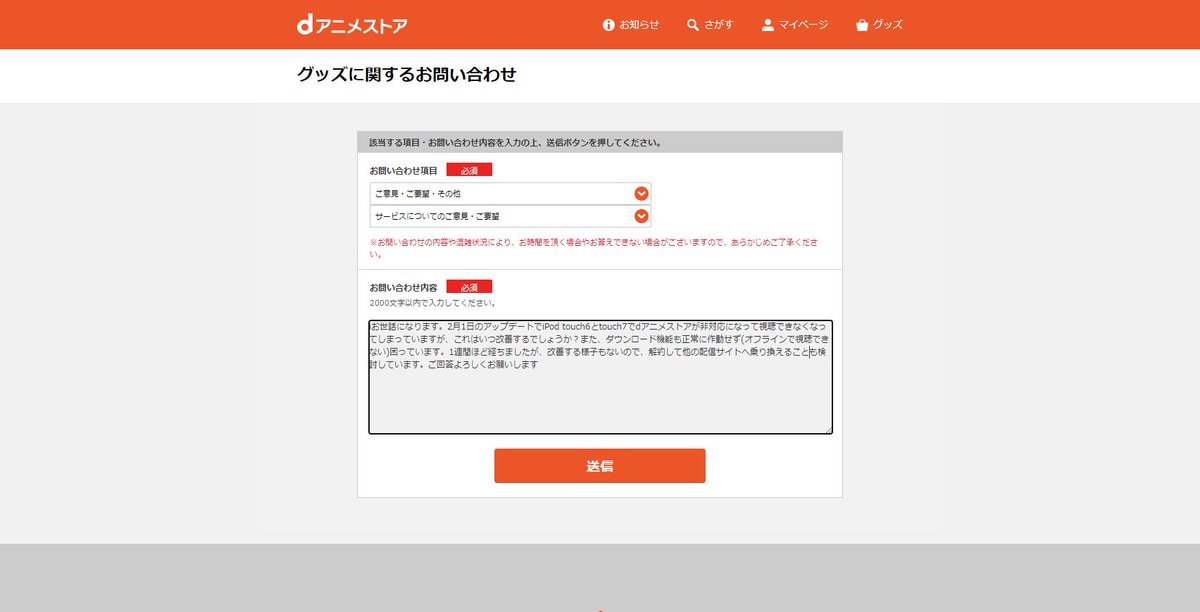 dアニメストアの お問い合わせフォーム から直接問い合わせをする方法 ios10 3 3 dアニメストア10 1 0 17 9 0 ドコモでの契約無し wi fi接続 docomogeek