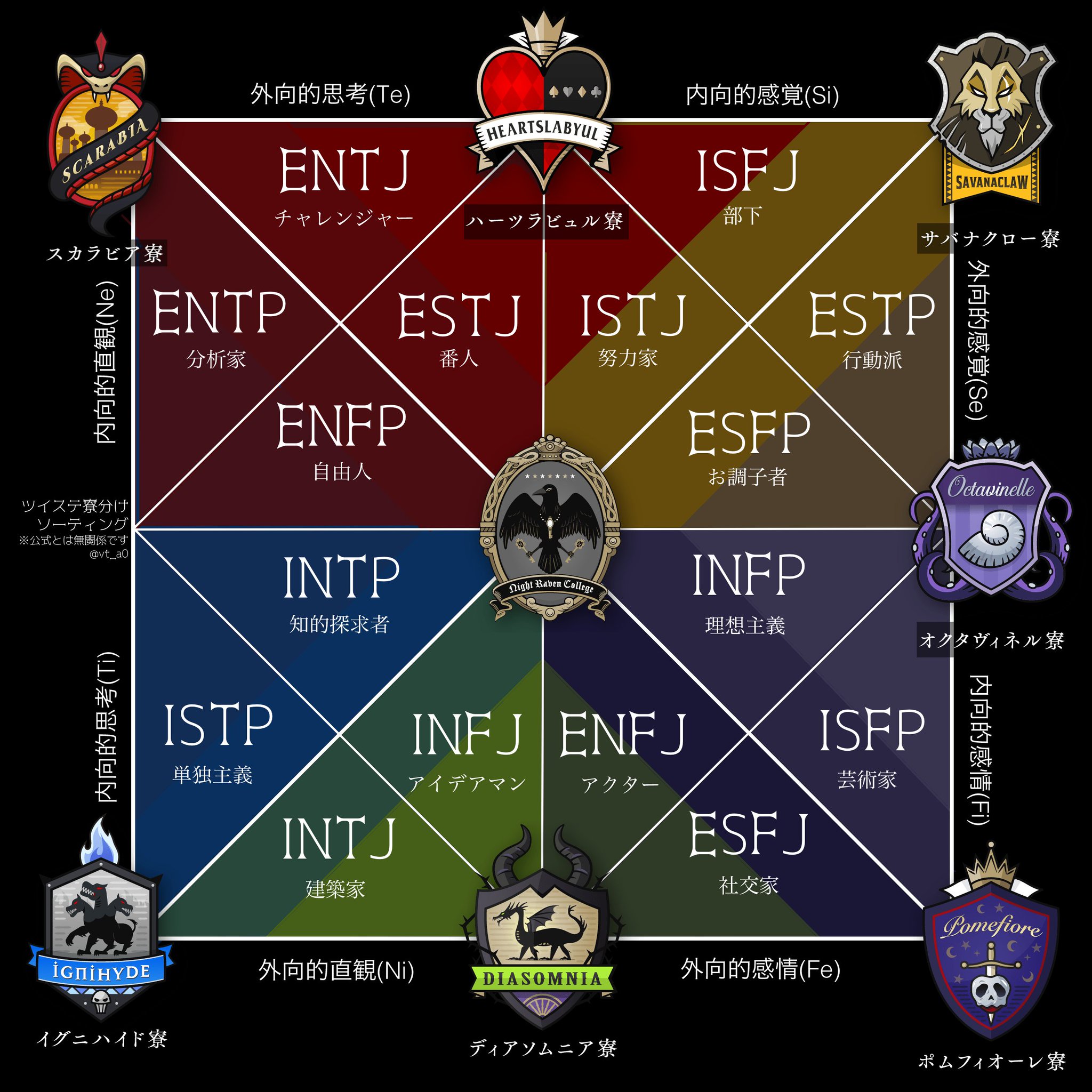 めのう on twitter 寮の精神に基づくmbtiツイステ寮分けソーティングを作成してみました https t co hnmzed2uuc 上記サイト等でご自分のタイプを診断してから表を参考にしてみてください 詳細はツリーに繋げます